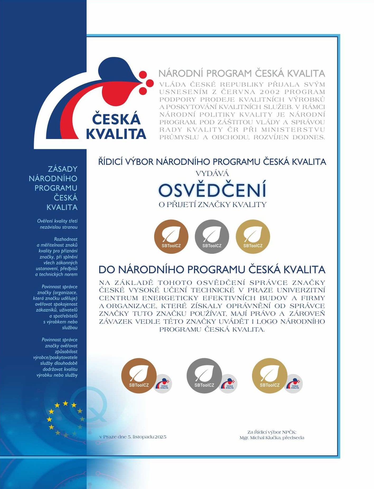 Na zasedání Řídicího výboru Národního programu Česká kvalita, které proběhlo 5. listopadu 2025, byly do prestižního portfolia zařazeny certifikáty SBToolCZ (bronzový, stříbrný a zlatý). Tím se rozšiřuje soubor ověřených značek, které poskytují spotřebitelům, investorům i odborné veřejnosti spolehlivou garanci kvalitních výrobků a služeb na českém trhu.